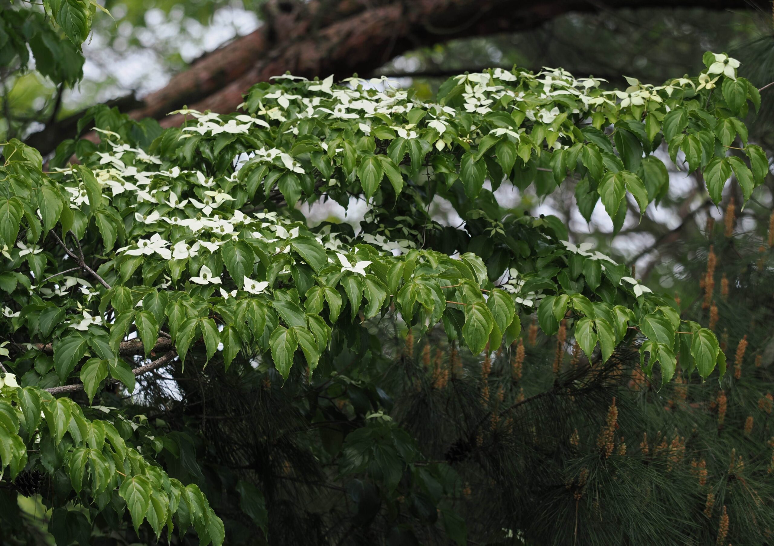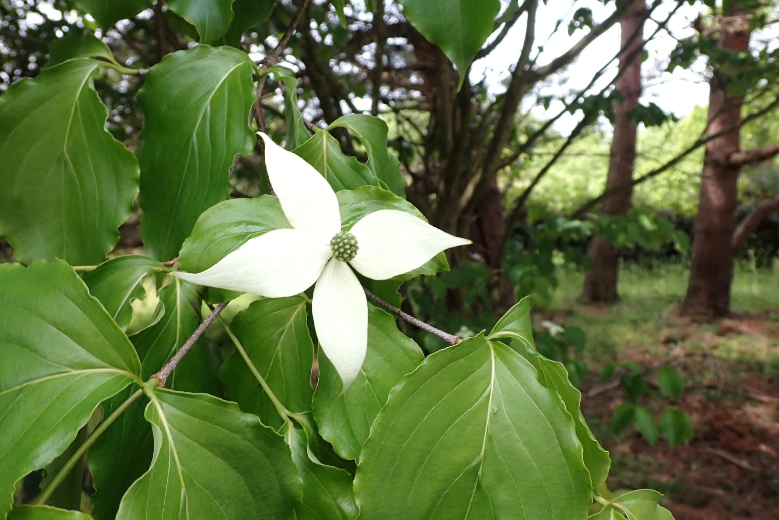 ビジターセンターの園地のヤマボウシの白い花が見頃を迎えようとしています。