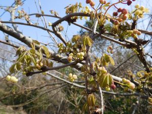 3/24 アケビ(木通) 雌雄同株ですが、雄花と雌花では、形状が異なります。 雄花は垂れ下がった花序の先端に多数付き、雌花は、雄花よりも大きく、1個つきます。