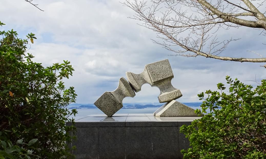 世界的なアーティスト・流政之の彫刻があるのは、大崎山園地。「またきまい」は、香川の方言で「また来てください」という意味。春はサクラが満開に!