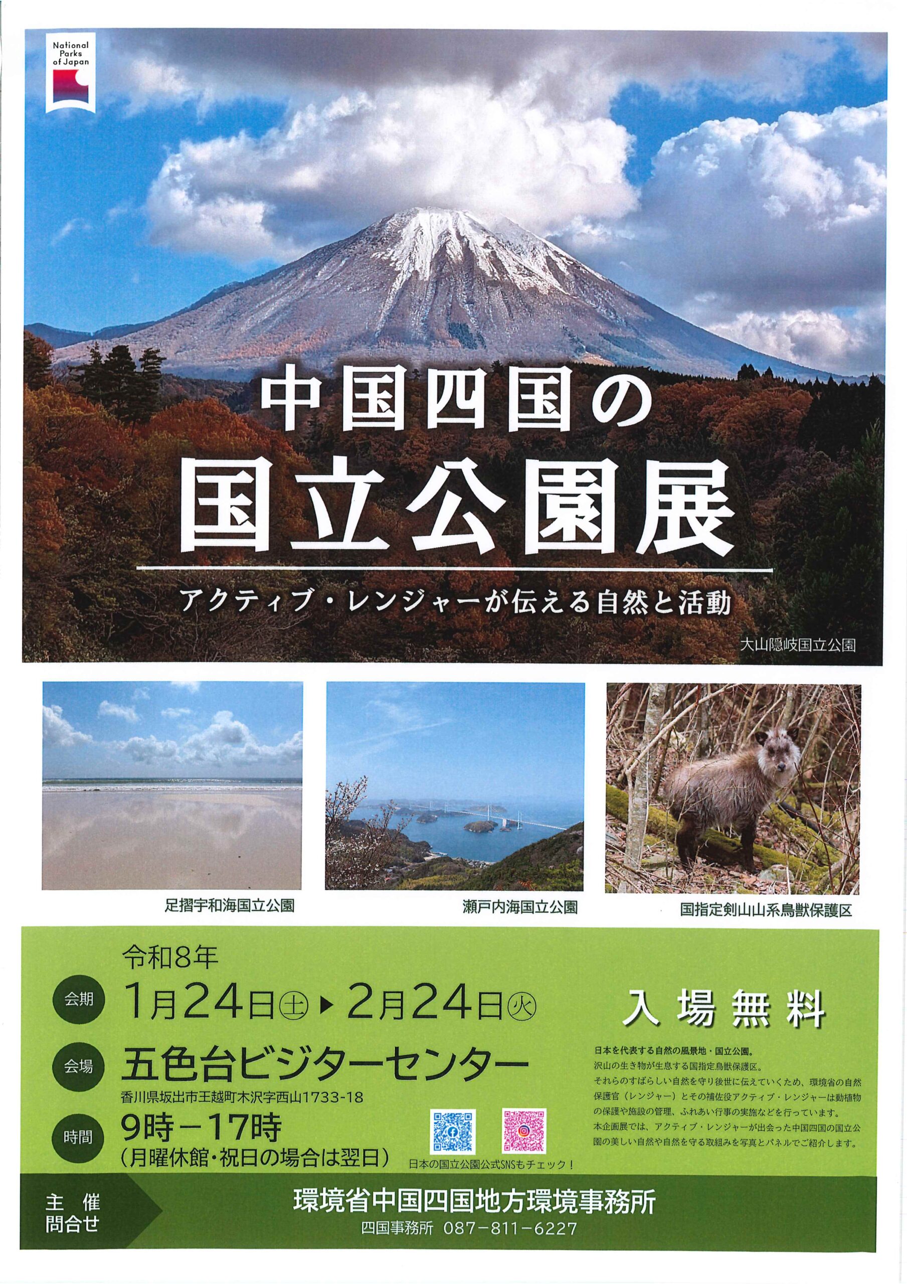 環境省のアクティブ・レンジャー(自然保護官補佐)が出会った中国四国の国立公園の美しい自然や自然を守る取り組みを、写真とパネルで紹介します。